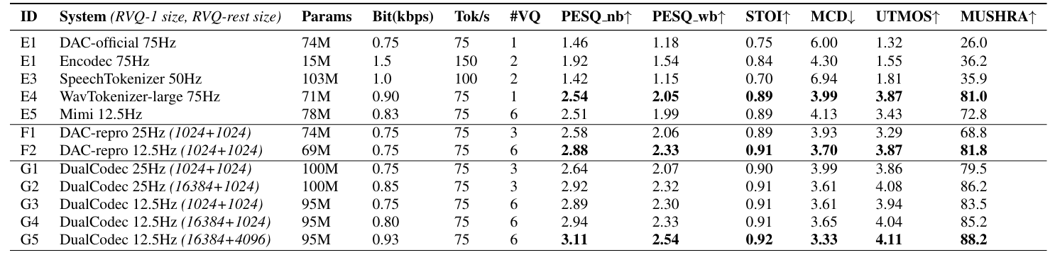- 전체적으로 DualCodec의 성능이 가장 뛰어남