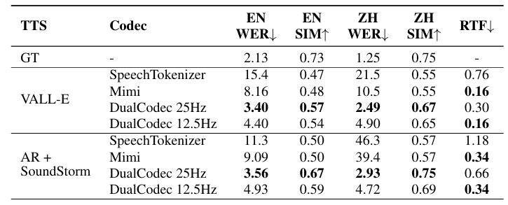 - VALL-E와 SoundStorm에 대해 DualCodec을 사용하는 경우 최고의 TTS 성능을 달성할 수 있음