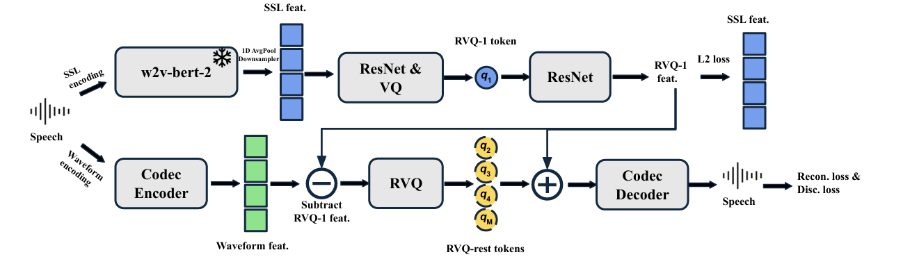 - Semantic Enhancement : SpeechTokenizer와 같이 rich pronunciation, semantic information을 가지는 Self-Supervised Learning (SSL) feature를 활용할 수 있어야 함