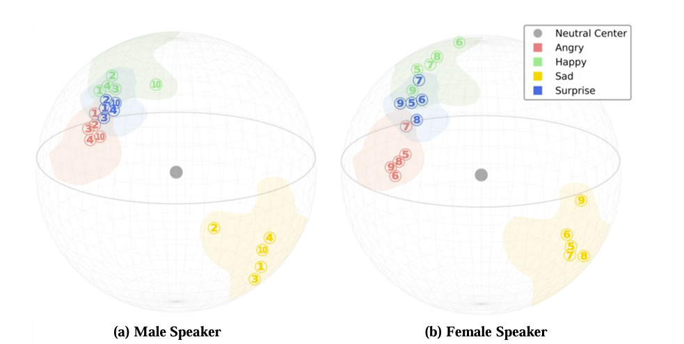 - Speaker embedding은 각 speaker의 embedding space 내에서 서로 다른 emotional state를 따라 cluster 됨