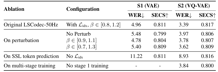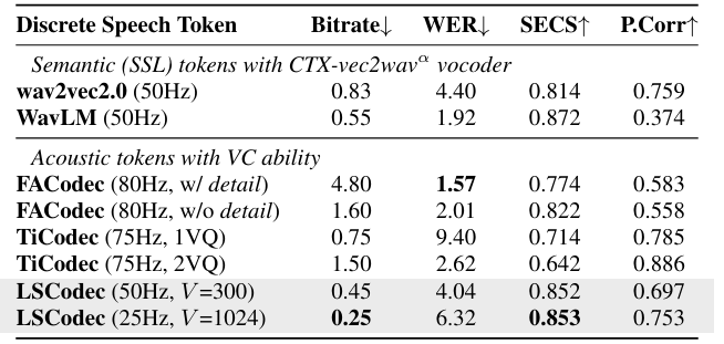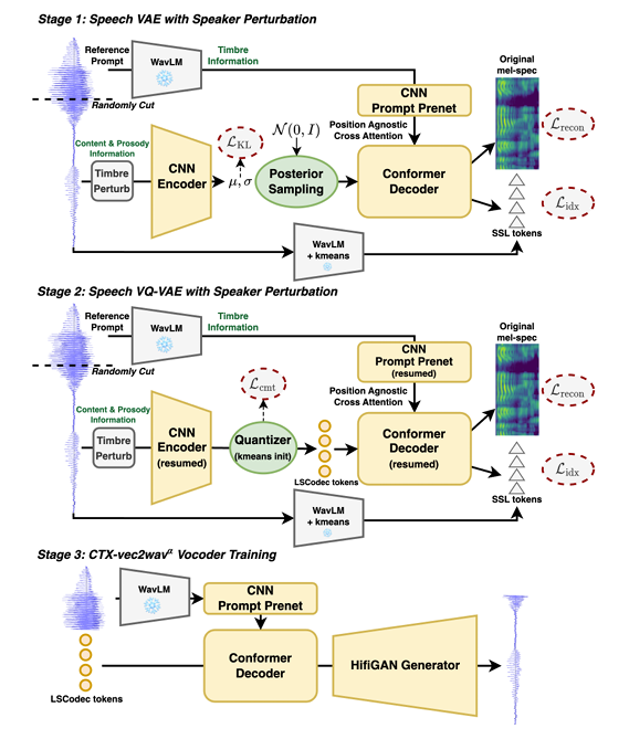 - 이때 LSCodec token은 timbre를 decently remove 하므로 strong timbre controllability를 가진 CTX-Vec2Wav를 vocoder로 채택함