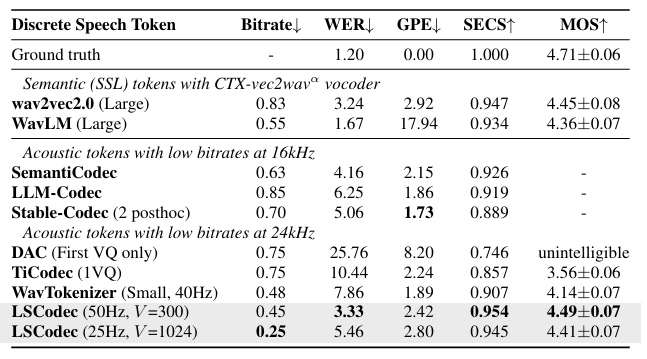 - 특히 speech token의 bitrate는 quantizer 수 $Q$, frame rate $F$, 각 quantizer의 vocabulary size $V$에 따라 $Q\times F\times \lceil \log_{2} V\rceil \text{bps}$로 결정됨