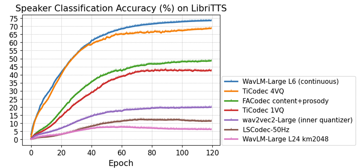 - LSCodec은 가장 낮은 probing accuracy를 보이므로, speaker timbre를 효과적으로 remove 할 수 있음