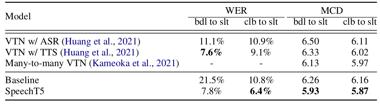 - Voice Conversion (VC) task에서도 SpeechT5가 우수한 성능을 보임