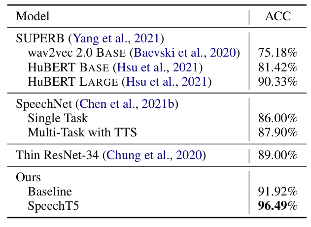 - SpeechT5는 Speech Identification (SID)에서도 우수한 성능을 보임