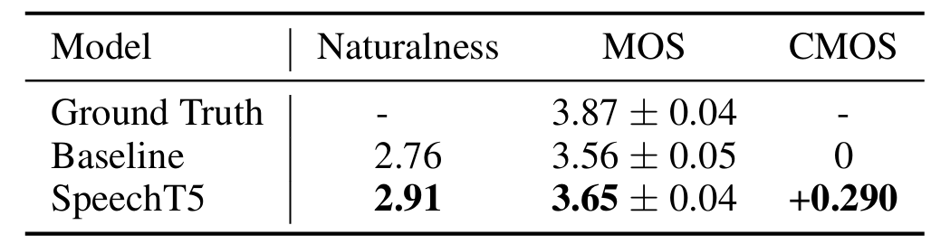 - Text-to-Speech (TTS) task에 대해 SpeechT5를 사용하면 naturalness를 향상할 수 있음