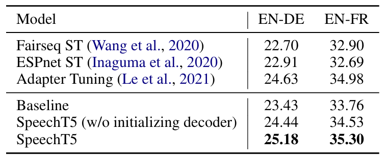 - Speech Translation (ST) 측면에서도 SpeechT5가 적합함