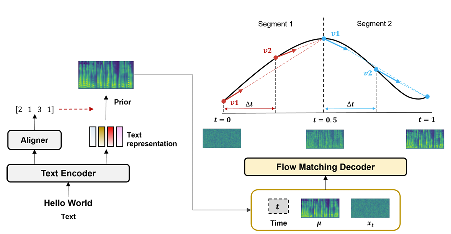 $\,\,\,\,\,\,\,\,\,\,\,\,\,\,\,\,\, f_{\theta}^{i}(t,x_{t},\mu) =x_{t}+\left((i+1)/S-t\right)\times v_{\theta}^{i}(t,x_{t},\mu)$ - 결과적으로 RapFlow-TTS는 각 segment에서 consistent vector field로 straight flow를 학습하여 piecewise linear trajectory로 data distribution을 effectively represent 함