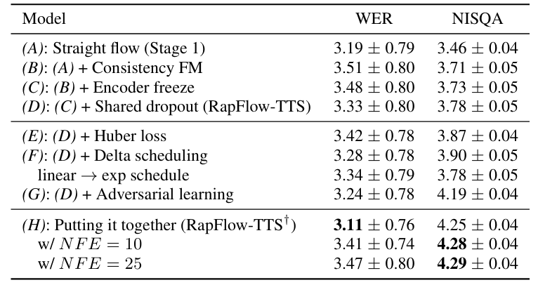 - 각 component는 RapFlow-TTS의 성능 향상에 유효함