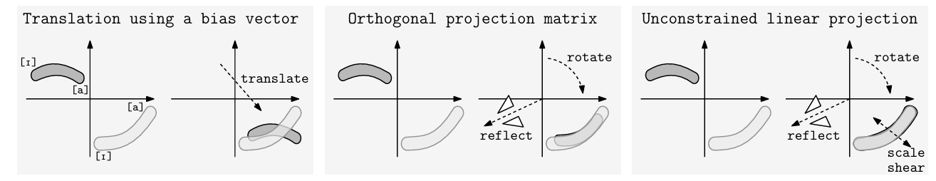- 아래 그림과 같이 bias vector, $\mathbf{W}$에 대한 orthogonal constraint, no constraint의 3가지 transformation을 고려하자