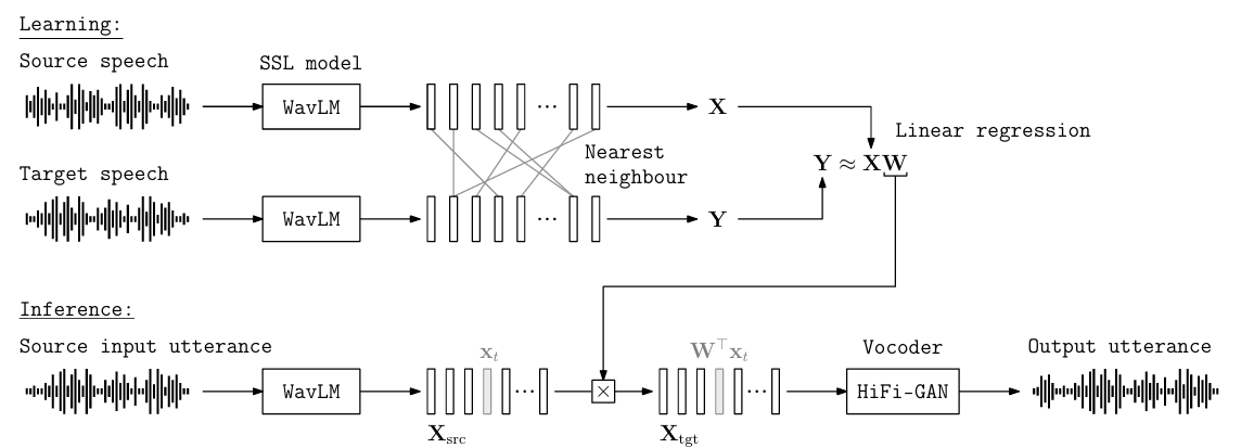 - WavLM의 intermediate layer feature를 기반으로 source, target frame 간의 linear projection을 학습