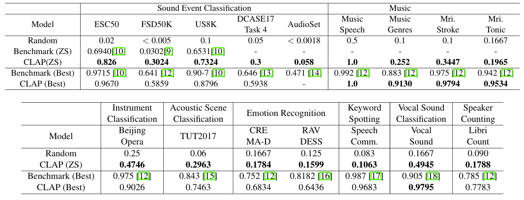 - 여러 downstream task에 대해 CLAP은 뛰어난 성능을 보임