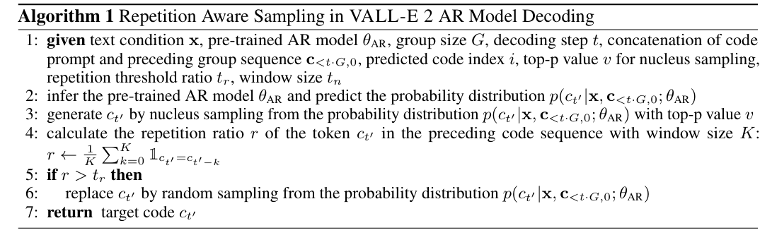 (Eq. 20) $\,\,\,\,\,\,\,\,\,\,\,\,\,\,\,\, =\arg\max_{\mathbf{c}\geq T',0}\sum_{t=T'/G}^{T/G-1}\sum_{t'=t\cdot G}^{(t+1)\cdot G-1} \log p\left(c_{t',0}|\mathbf{x},\mathbf{c}_{<t\cdot G,0};\theta_{AR}\right)$ - VALL-E의 random sampling method와 달리 VALL-E2에서는 decoding stability를 위해 아래 [Algorithm 1]과 같은 Repetition Aware Sampling을 도입함