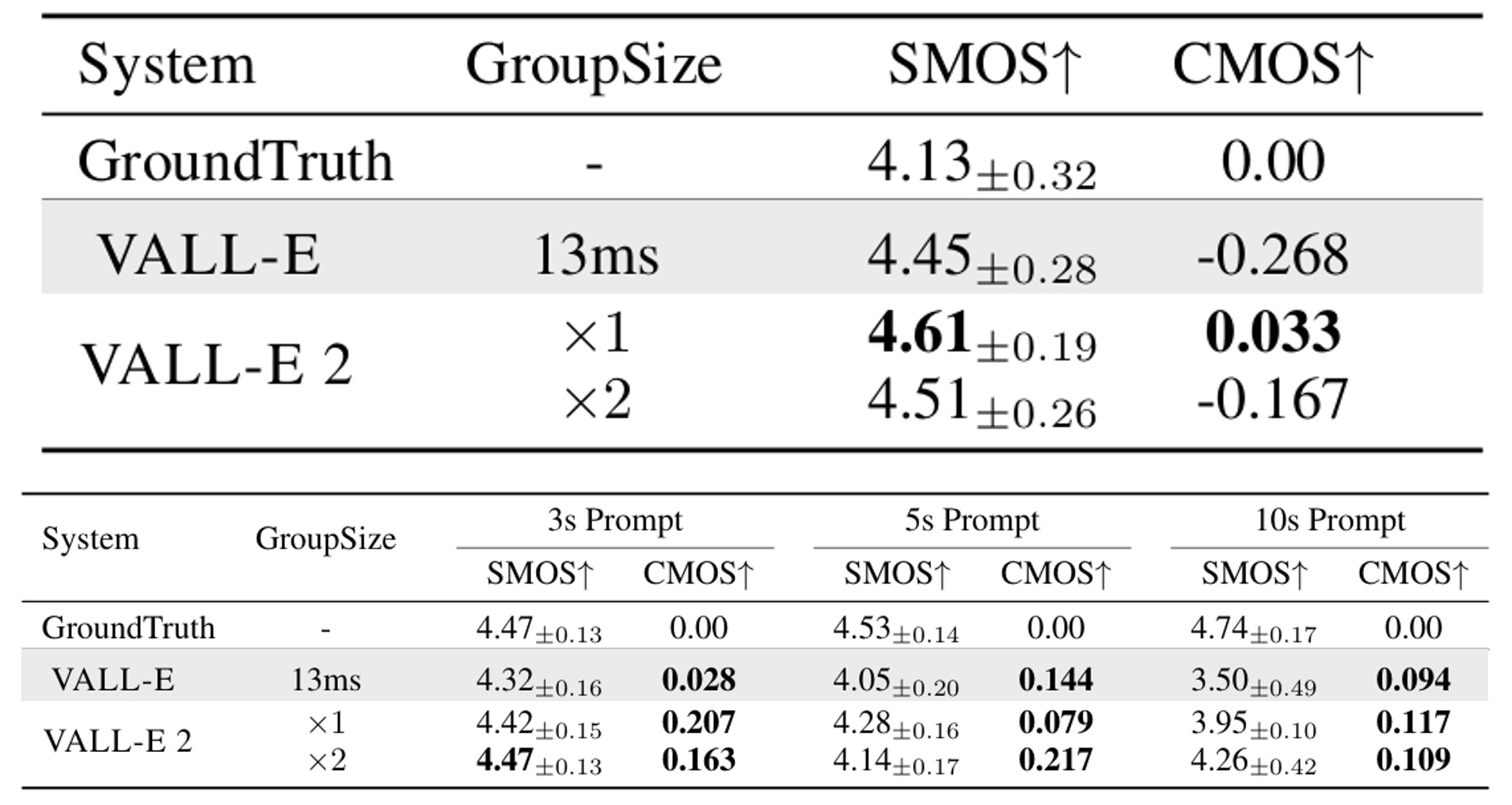 - MOS 측면에서도 VALL-E2는 우수한 결과를 달성함