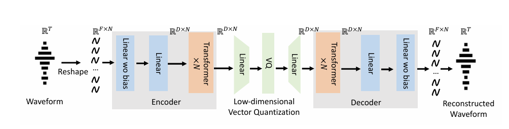 - 이때 codebook dimension은 $8$ 또는 $16$이고 codebook size는 $65536$ 또는 $131072$ - Decoder는 encoder의 symmetric structure로써 2개의 linear layer를 가진 Transformer layer stack으로 구성됨