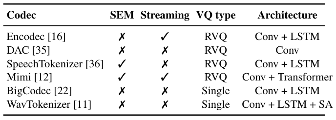 - Comparisons : EnCodec, DAC, SpeechTokenizer, WavTokenizer, Mimi, BigCodec