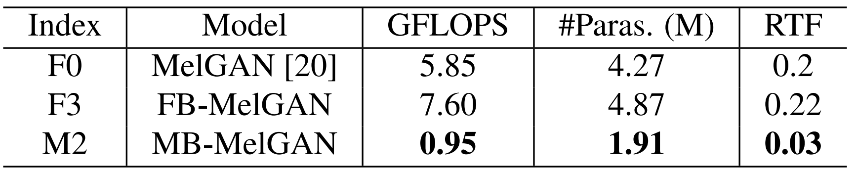 - 모델 복잡도 측면에서도 제안하는 MB-MelGAN이 가장 적은 GFLOPS와 빠른 합성속도(RTF)를 보임