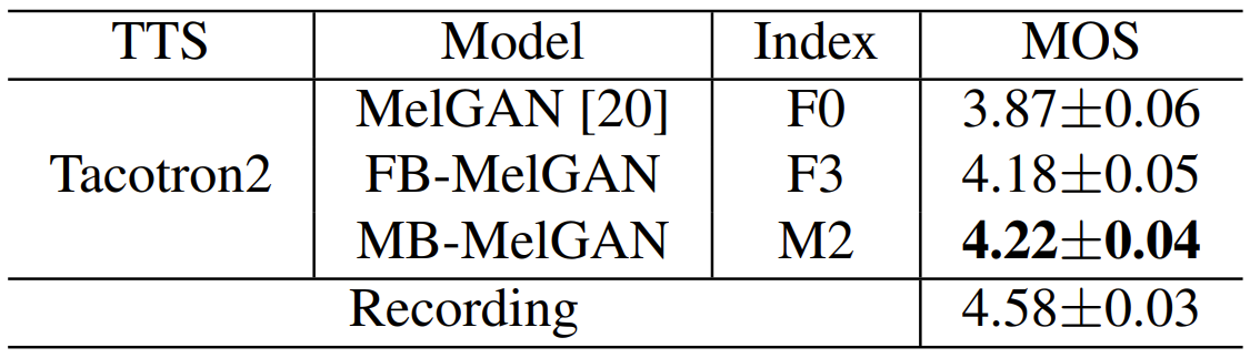 - MB-MelGAN을 사용했을 때 가장 실제와 비슷한 음성 품질을 보임