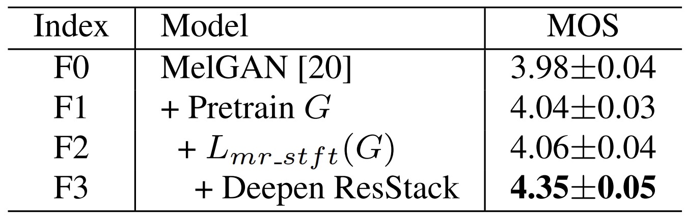 - ResStack을 통해 receptive field를 확장한 결과, 상당한 MOS 개선이 이루어짐