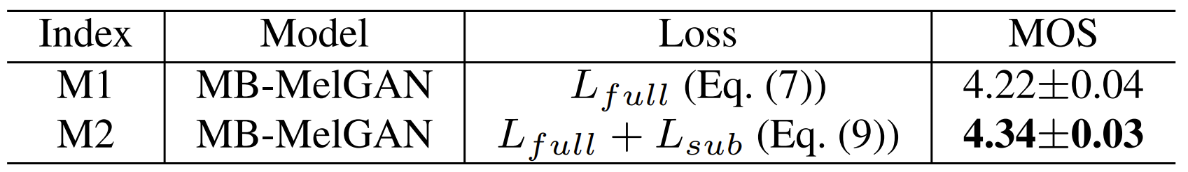- Full-band와 sub-band multi-resolution STFT loss를 결합했을 때 큰 MOS 개선이 가능