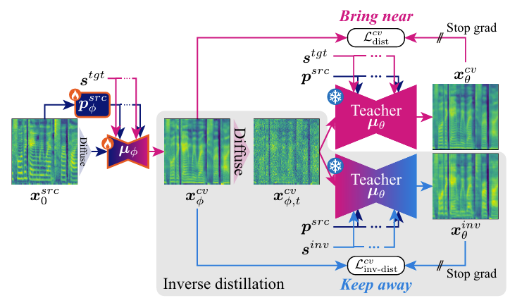 - $\mathbf{x}_{\theta}^{inv}=\mu_{\theta}(\text{sg}(\mathbf{x}_{\phi,t}^{cv}),t, \mathbf{s}^{inv},\mathbf{p}^{src})$ : other speaker embedding $\mathbf{s}^{inv}$, $\mathbf{p}^{src}$에 대한 teacher model $\mu_{\theta}$를 통해 $\mathbf{x}_{\phi}^{cv}$를 diffuse/reversely diffuse 하여 얻어짐 - Reconversion이 적용된 경우, 유사한 loss $\mathcal{L}_{inv\text{-}dist}^{cv2}$가 reconverted mel-spectrogram $\mathbf{x}_{\phi}^{cv2}$에 적용됨
