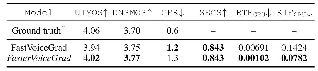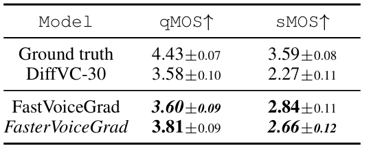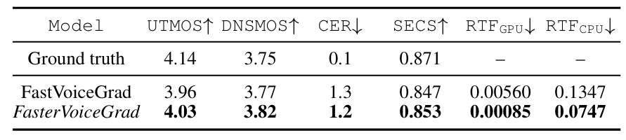- 전체적으로 FasterVoiceGrad의 성능이 더 우수함