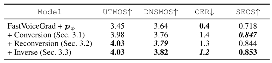 - 구조적으로는 FastVoiceGrad의 computationally intensive Conformer-based content encoder를 training 중에 freeze 하고 trainable, computationally efficient CNN $\mathbf{p}_{\phi}$로 replace 함