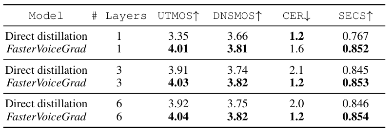- Direct distillation과 비교하여 FasterVoiceGrad training이 더 효과적임