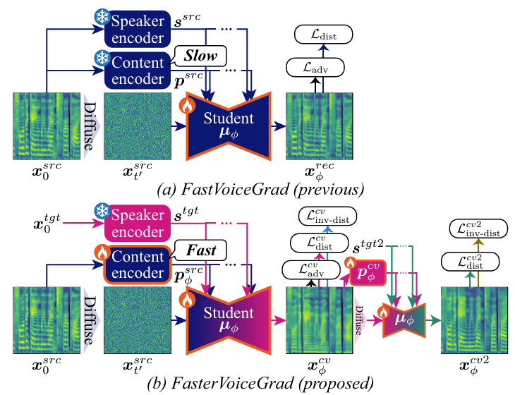 - FasterVoiceGrad는 reverse diffusion module과 content encoder를 distill 하여 conversion을 speed up 함