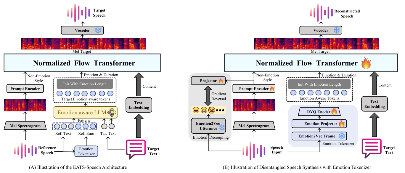 - 결과적으로 EATS-Speech framework는 Emotion Tokenizer, Emotion-Aware LLM을 중심으로 구성됨