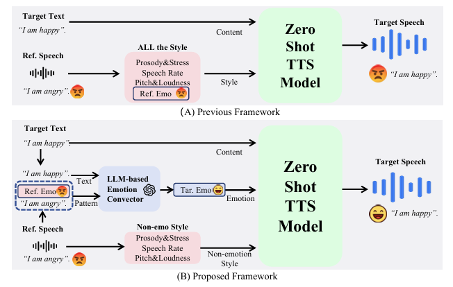 - BUT, emotion 측면에서 zero-shot TTS model은 여전히 modeling의 한계가 있음 - 기존 zero-shot TTS에서는 emotion을 reference speech의 global representation에 embed 된 style attribute로 취급하므로 다음의 문제가 발생함: