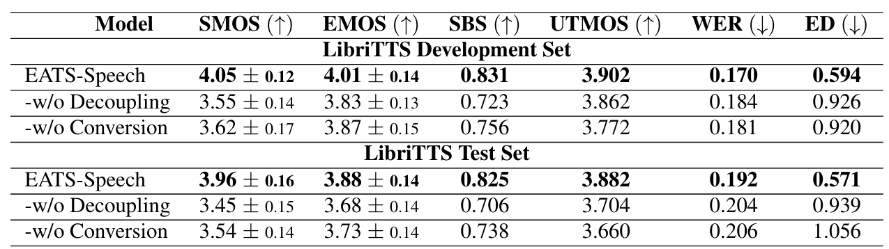 - 전체적으로 EATS-Speech의 성능이 가장 뛰어남