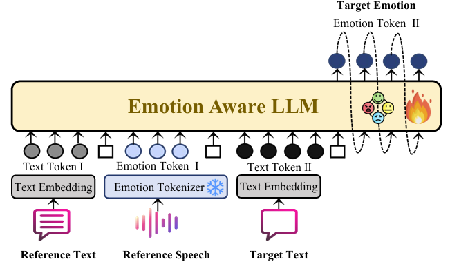 - Emotion-Aware LLM은 reference speech에서 추출된 emotion token, reference text, target text을 input으로 사용함