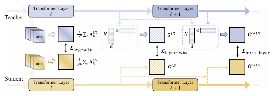(Eq. 1) $ \mathcal{L}_{avg\text{-}attn}=\sum_{\ell=1}^{L}\sum_{t=1}^{N}D_{KL}\left( \left.\left.\frac{1}{H^{T}}\sum_{h=1}^{H^{T}}\mathbf{A}_{h,t}^{\ell,T}\right|\right| \frac{1}{H^{S}}\sum_{h=1}^{H^{S}}\mathbf{A}_{h,t}^{\ell,S}\right)$