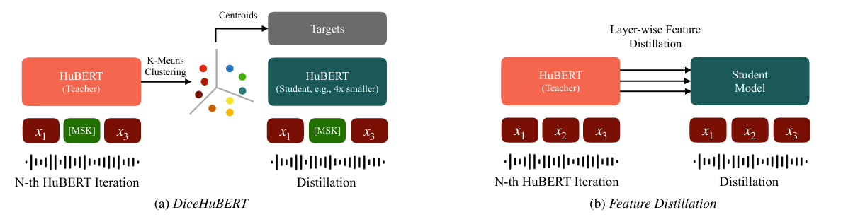- DiceHuBERT는 $N$ (teacher) iteration에서 $N+1$ (student) iteration으로 transition 할 때, model size를 줄이기 위해 original SSL objective를 maintain 하는 HuBERT iterative self-distillation process를 활용함