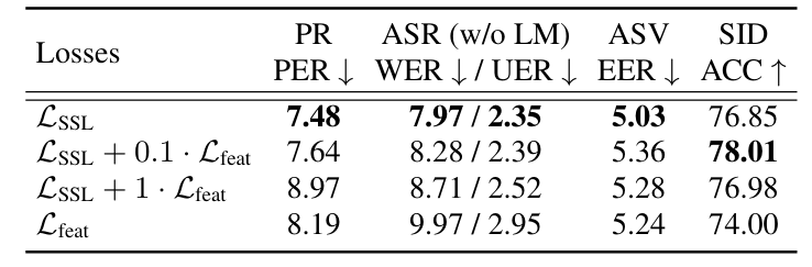 - HuBERT-base의 feature dimension $D_{base}$에 대해, $D^{S}=D_{base}/2$로 student를 설정했을 때 최고의 성능을 달성함