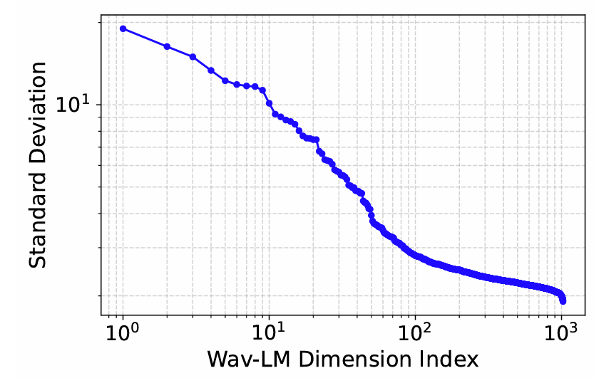 - 이는 두 WavLM embedding 간의 $L2$ (cosine) distance가 significant 100 component에 의해 primarily determine 되고 1024개의 component 중 900개는 ignore 된다는 것을 의미함