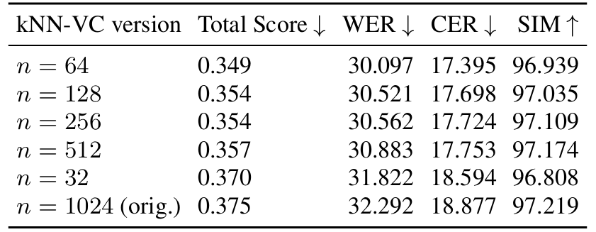 - 실제로 아래 표와 같이 time에 따른 standard deviation으로 sort 된 first $n$ componet에 대한 trimmed $k$NN-VC의 성능을 비교해 보면, trimmed $k$NN-VC는 baseline과 거의 동일한 성능을 가짐