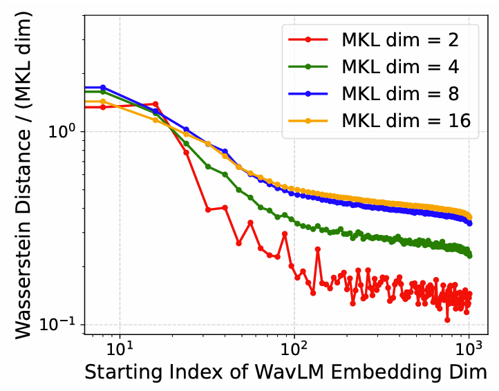 - 이때 lower MKL dimension $K$는 Gaussian distribution에 대해 smaller Wasserstein distance로 이어짐 - 추가적으로 Wasserstein distance는 WavLM dimension이 낮을수록 더 높은 값을 가짐