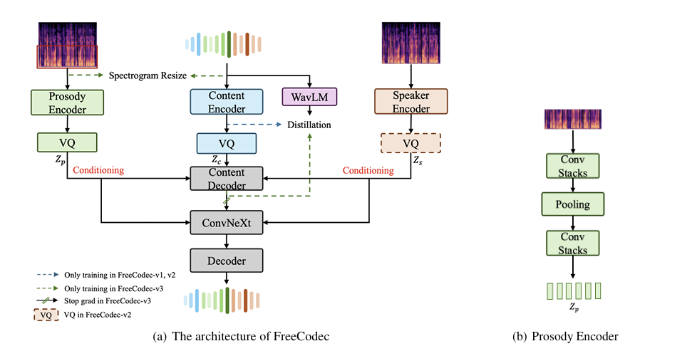- 이때 speaker embedding을 $8$ group으로 divide 하고 $1024$ codebook size로 codebook을 quantize 함 - FreeCodec-v1, FreeCodec-v3의 경우 FACodec과 유사하게, better reconstruction을 위해 continuous representation을 decoder에 제공함