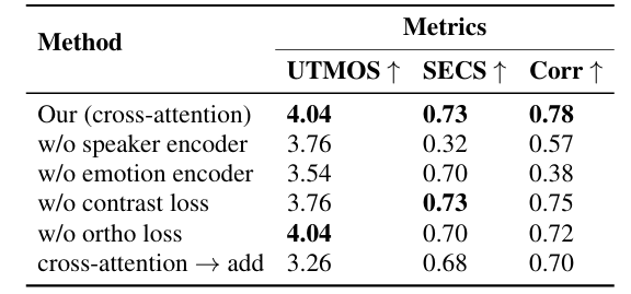 - Orthogonal constraint loss (emotion/speaker/content feature independence)