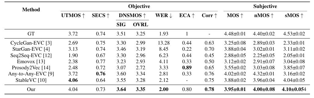 - Comparisons : StableVC, CycleGAN-EVC, StarGAN-EVC, Seq2Seq-EVC, EmoVox, Prosody2Vec, Any-to-Any-EVC
