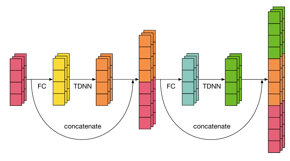 - 이때 논문은 D-TDNN layer의 input과 inner output을 concatenate 하여 final output을 구성하고, TDNN-ReLU-BatchNorm (BN)을 memory-friendly 한 BN-ReLU-TDNN으로 replace 함