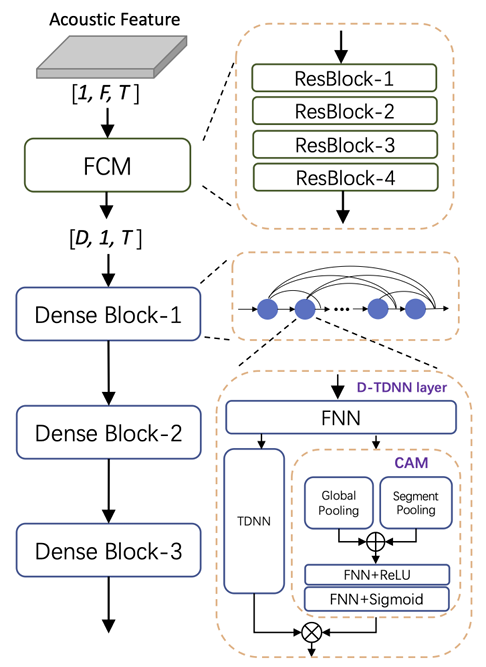 - Lighter CAM module을 Densely-connected TDNN (D-TDNN)에 insert 하여 speaker focusing을 향상