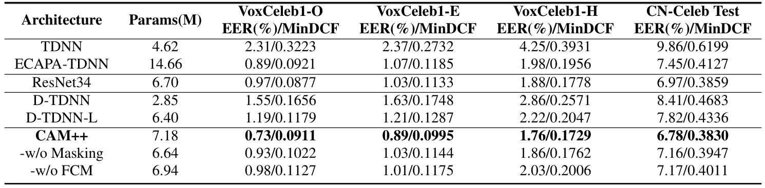 - CAM과 비교하여 CAM++는 더 적은 parameter와 더 나은 성능을 가짐
