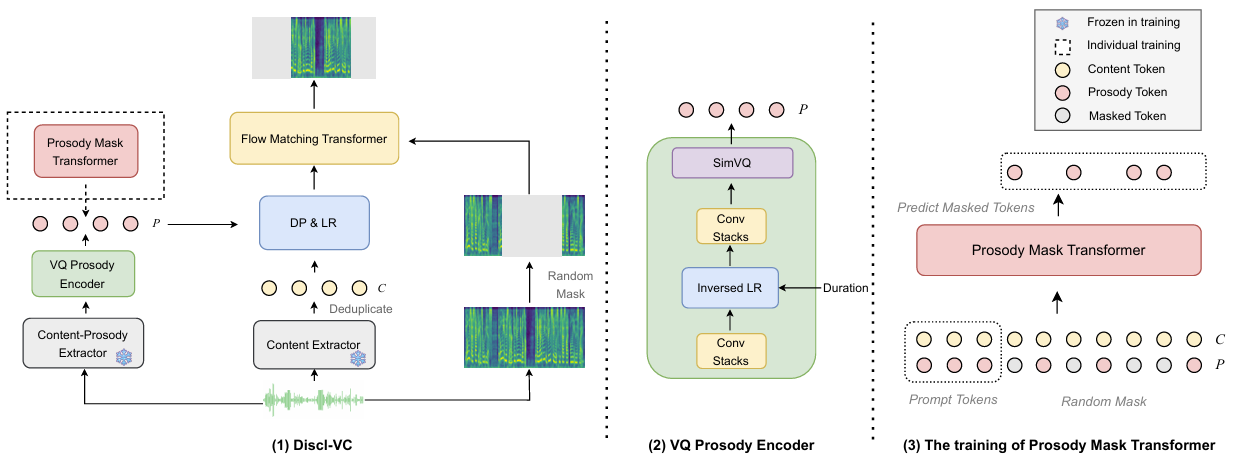 - 먼저 논문은 VQ prosody encoder, DP&LR, flow matching Transformer를 jointly training 하여 speech decoupling과 high-quality zero-shot VC를 학습함: