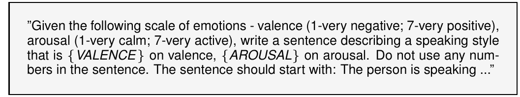 - 이를 위해 논문은 아래와 같은 prompt를 적용한 LLM을 활용해, valence, arousal을 기반으로 pseudo-caption을 생성함