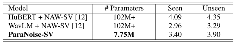 - ParaNoise-SV는 seen/unseen condition에 상관없이 안정적인 성능을 달성함