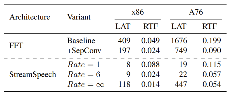- StreamSpeech는 x86에서 79ms (0.155 RTF), A76에서 276ms (0.289 RTF)를 달성
