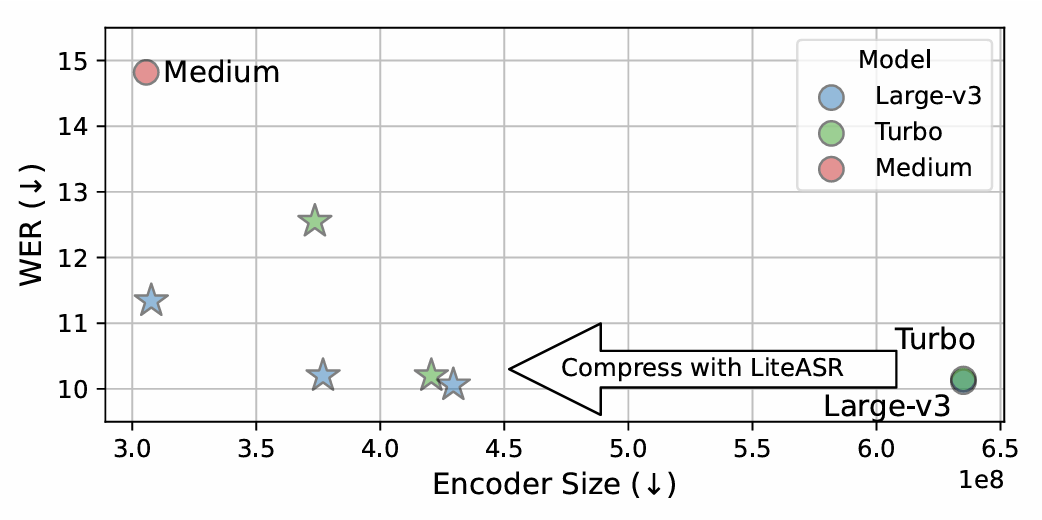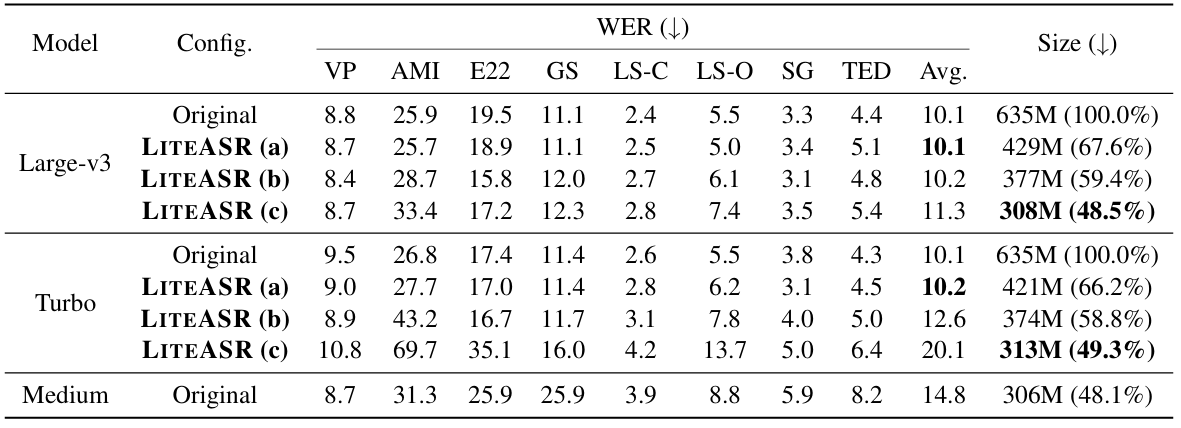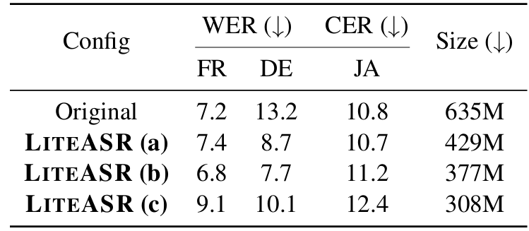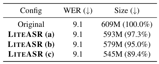 - 전체적으로 LiteASR은 더 작은 parameter size로 더 우수한 WER을 달성함